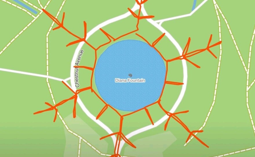 Glancing at a map earlier this month, Owen Delaney realized something funny: Seen from above, the Diana Fountain in London's Bushy Park bears a striking resemblance to the bulbous nose of Rudolph the Red-Nosed Reindeer — at least, it would if that famous nose of his were blue. At any rate, that fountain-nose would look better if seen in the context of a full face.