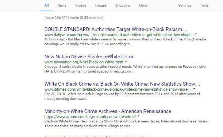 Google searches for "black on white crime" conducted by NPR in December 2016 and January 2017 found the top results included multiple white supremacist websites, but didn't include anything from the Council of Conservative Citizens.
