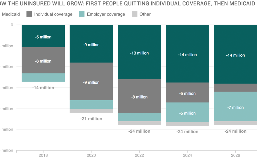 Put into raw numbers, here's how the growth in the number of uninsured looks: In 2018, the number of uninsured would be 14 million larger under the Republican bill than under Obamacare. In 2026, it would be 24 million larger.
