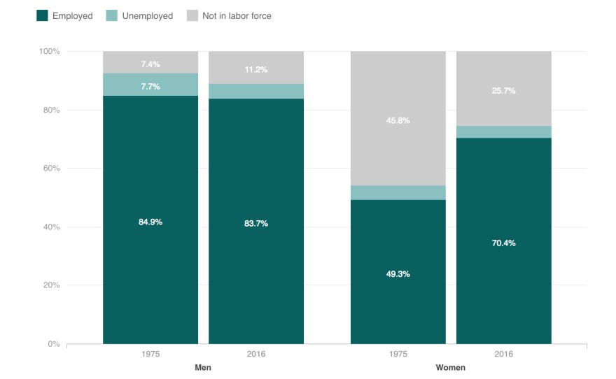 In 1975, close to 67 percent of adults from ages 25 to 34 were employed full time, and that share increased to 77 percent by 2016, according to a new report on young adults by the U.S. Census Bureau.