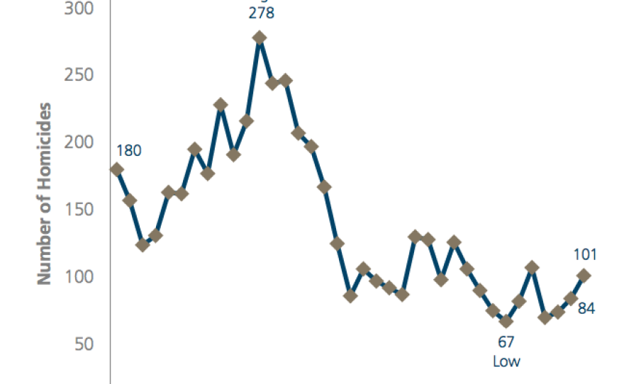 The number of homicides in the county rose for the third year in a row to 101 — 17 more than 2015. The total is the most since 2012 but still well below the high of 278 in 1991.
