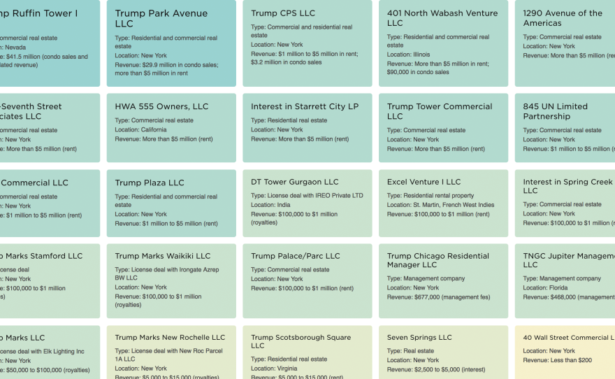 NOTE: All companies, locations and revenues listed below are as reported by Trump in his Office of Government Ethics filing. In most cases, Trump reported revenues; in some, only ranges. We are including only revenue-generating assets and activities that discernibly fall into the categories below, based on the description reported on the form.