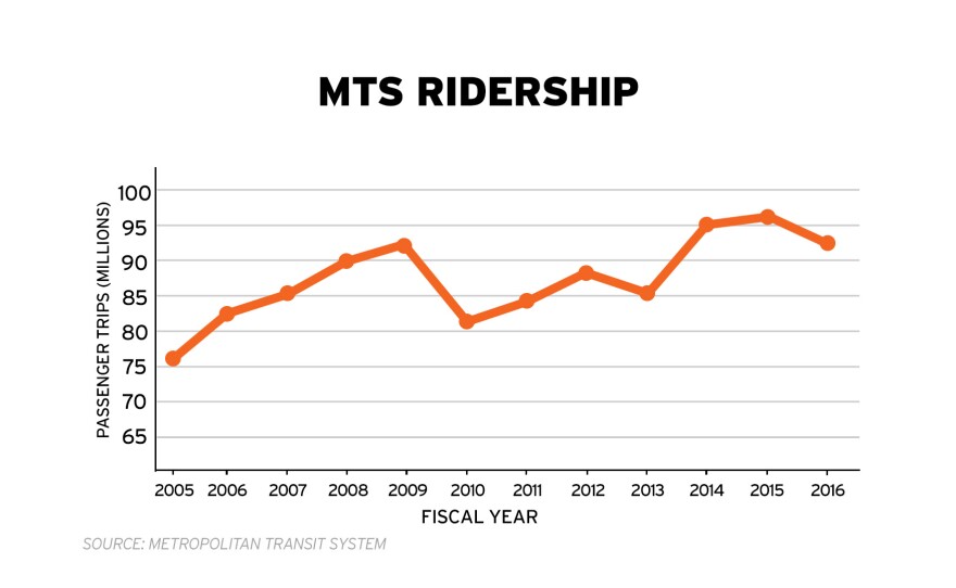 MTS ridership has generally trended upward since Jablonski first took the helm at MTS 13 years ago, reaching a record high of 96.7 million passenger trips in fiscal 2015. He said he hoped the current downward trend could be reversed soon, but that meeting the city of San Diego's transit goals could not be achieved with a "laissez faire" approach.