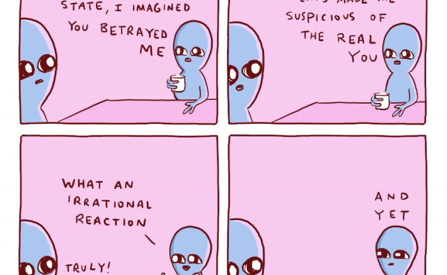 Nathan Pyle fills the pages of his new book Strange Planet with big eyed, bright blue aliens from a planet that shares a lot in common with Earth. These aliens sunbathe, sneeze and even wish each other sweet dreams like us, but they describe these practices with deadpan technical terminology like "sun damage" and "face fluid explosions." The lifegiver aliens even implore their offspring to "imagine pleasant nonsense" as they tuck them in for the night.