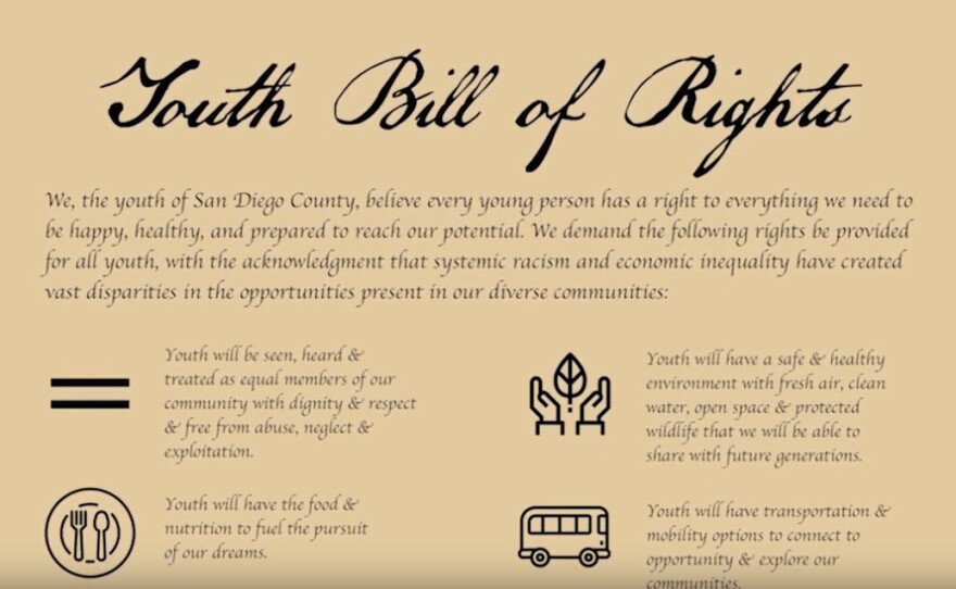 Q: Youth Will led an effort to come up with a Youth Bill of Rights for San Diego County. Can you tell me about the objective of this bill of rights?