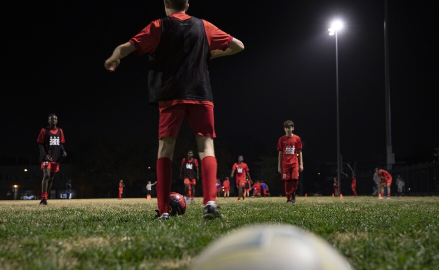 Fifteen-year-olds from a DCXI soccer team practice together in Washington, D.C., in November. Club co-founder and coach Pierre Hedji says some of their team members pay and some don't. "If you can afford to pay the whole thing, pay the whole thing. That way we can afford to help the next kid that can't pay anything at all."