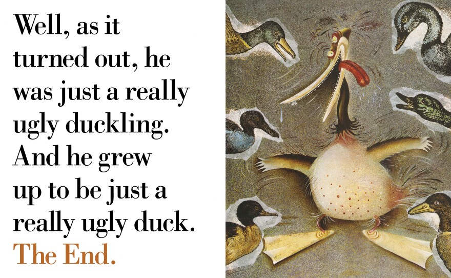 In the story of the Really Ugly Duckling, for example, the duck is very cartoon-y and stylized, but surrounding him is clip art and old engravings of actual ducks and geese and mallards. It's a nice contrast, Smith says, to have something wacky next to something scholarly.