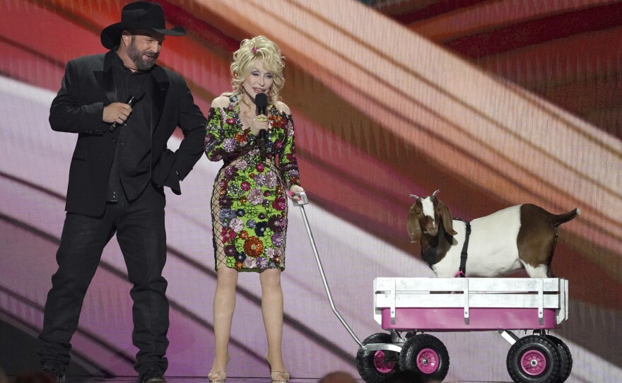 Hosts Garth Brooks, left, and Dolly Parton speak on stage with a goat at the 58th annual Academy of Country Music Awards on Thursday, May 11, 2023, at the Ford Center in Frisco, Texas.