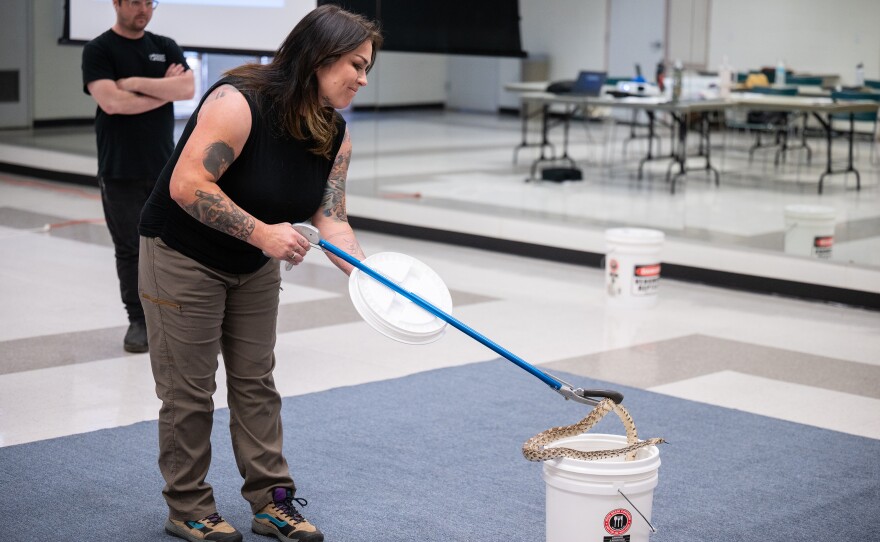 The trainings run through a host of rattlesnake information before teaching people how to safely grab snakes with tongs, plop them in a bucket and remove them from their homes. The students also get hands-on experience doing it.