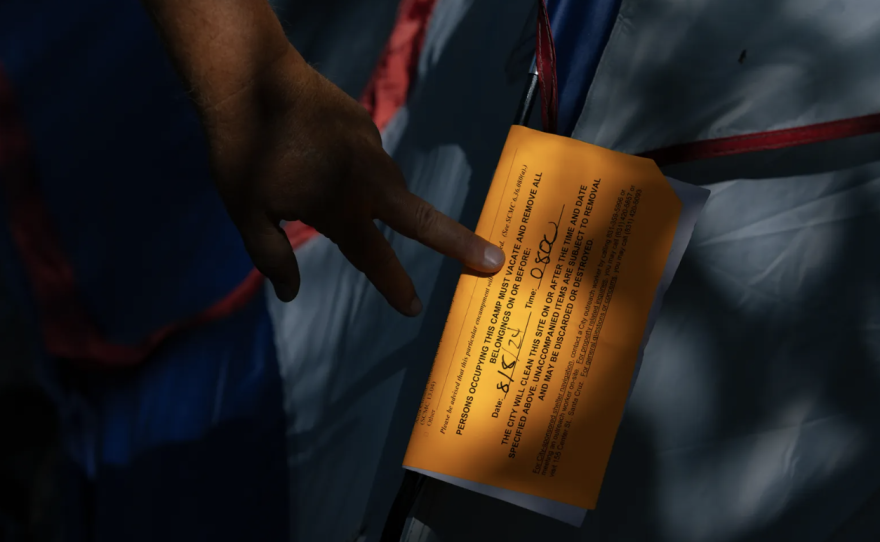 Segunda: Un aviso de desalojo en una carpa instalada en Pacific Avenue. Santa Cruz el 7 de agosto de 2024. Fotos de Manuel Orbegozo para CalMatters