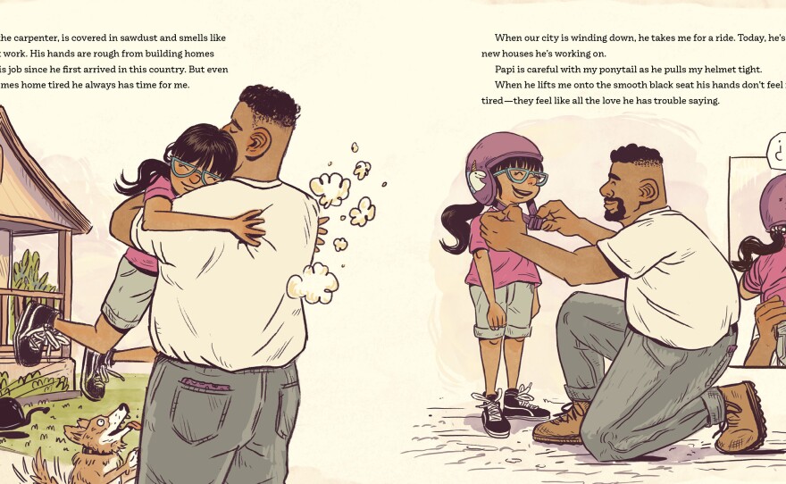 "For me in the book, it's like that first page — Daisy Ramona's working on the motorcycle, and she's working with this toolbox, and that was my dad, like that's kind of really what I got from my dad, was you know, learning how to work with my hands, learning how to work hard and stuff," Peña says. "But I think that with Isabel and I, it's nice because a lot of our backgrounds as people who identify as Latinx or Chicanx or Chicanos, there's this really narrow definition of what that is. But the nice thing with my collaboration with Isabel is that we span like a spectrum of that, right? And it doesn't necessarily look just one way. I hope that the youth reading our book walk away with a validation of their own story, and where their own family comes from and their heritage. And their right to it, their right to express that as they wish."