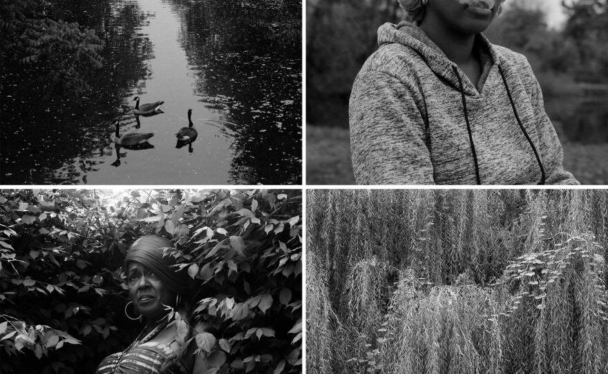 Thompson also invites viewers to revisit their own recollections through his selective visual compositions. A quick pace of vague images allows the reader to project — a folded sign affixed to a chain link fence, the point where a willow's limbs meet the ground, graceful fingers around an umbrella handle. Interspersed, direct portraiture brings pause. We spend time with the determined eye contact of a young girl with beaded braids and the knit brows of a woman set back in foliage.