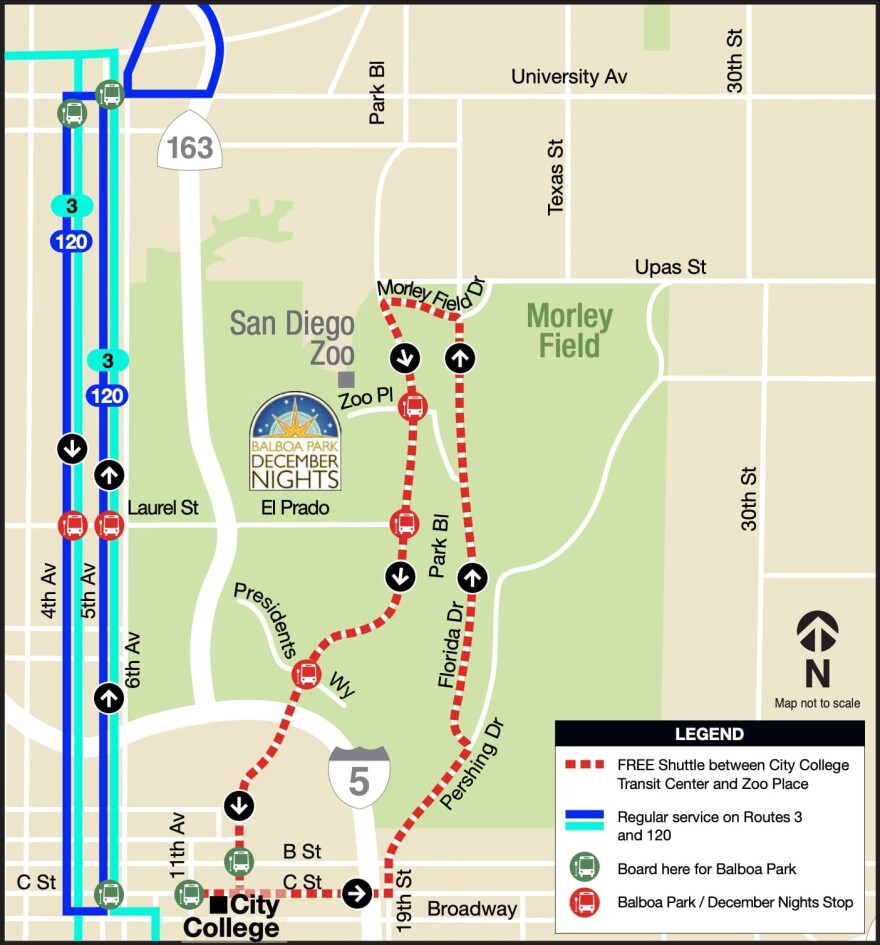 For more information about bus stops and schedules, visit the MTS December Nights guide here.