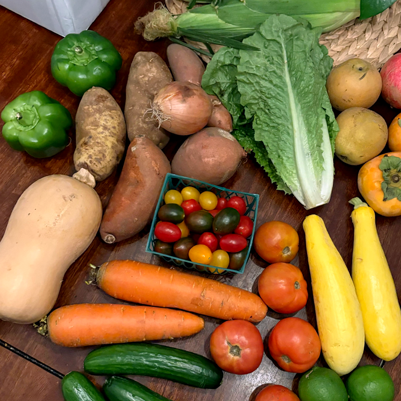 Yasukochi Family Farms CSA box of fresh fruit and vegetables