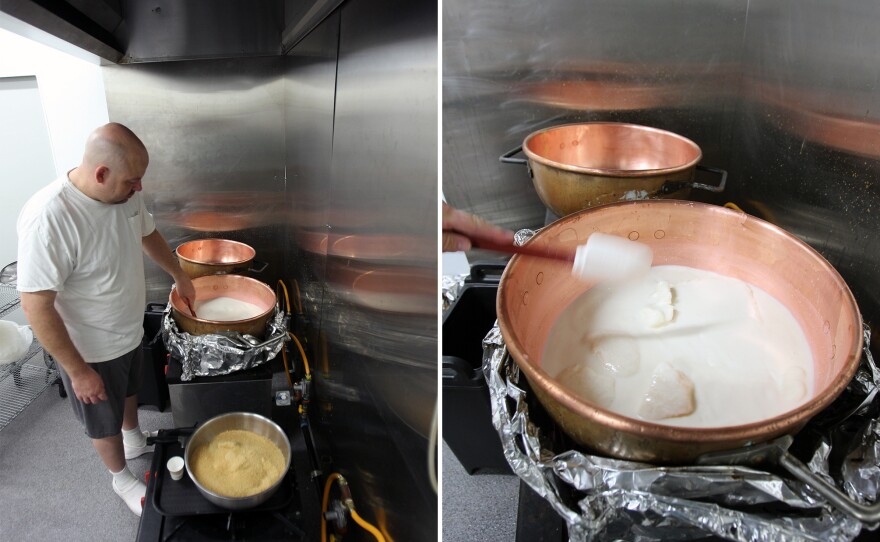 On their farm, Greg says he has many jobs — "dairyman, electrician, welder, plumber, frame builder [for the cheese-making plant and barns], obstetrician during lambing season, a confectioner, janitor, geneticist ... ." His list goes on. Here, he whips up some sheep's milk caramel.