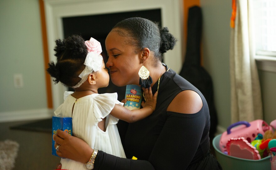 "Here I am, a transplant ... and I've taken advantage of all these opportunities," Smith says, while feeding her daughter Erelah a pouch of organic sweet potatoes. "Now some of it may be due to I have an education and same for my husband, but also it made ... my husband and I ... look at ways we can help bridge the gap."