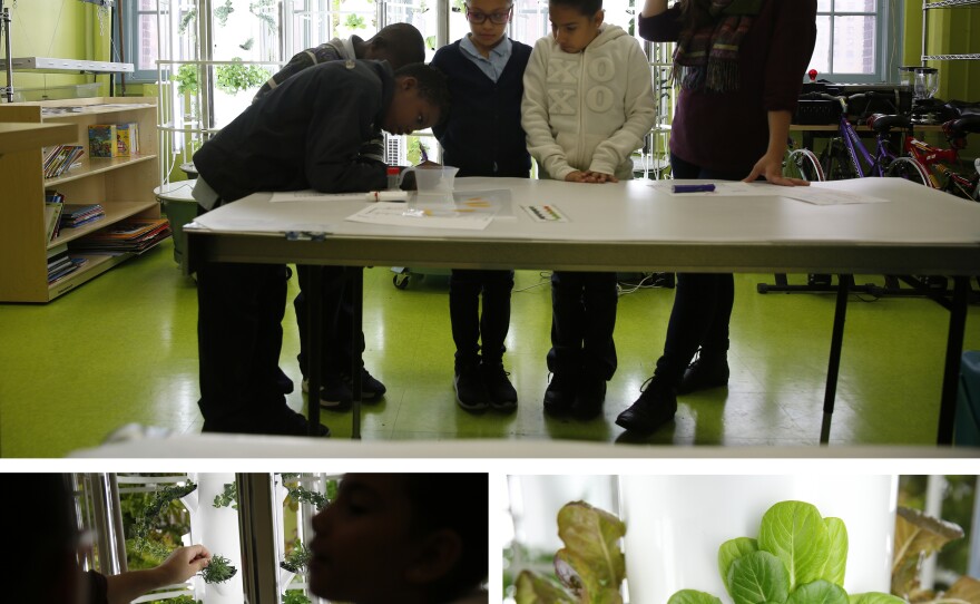 Jeffrey Haywood (far left) brings his grandson, Cori (far right), a third-grader. Haywood says he can't believe what Ritz is trying to do here. When he was a kid, Haywood says, "we didn't have no plants growing in no schools. If anything, we was trying to get into the schools."