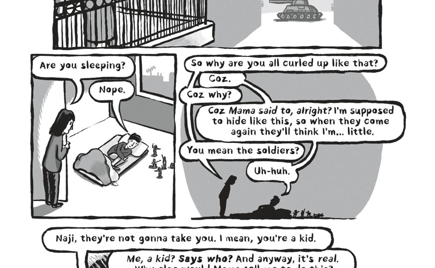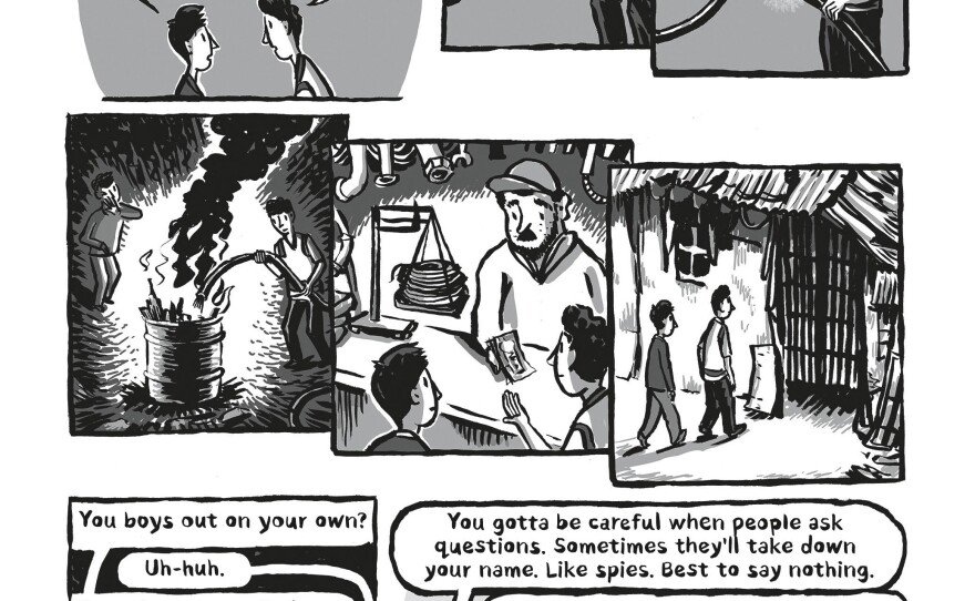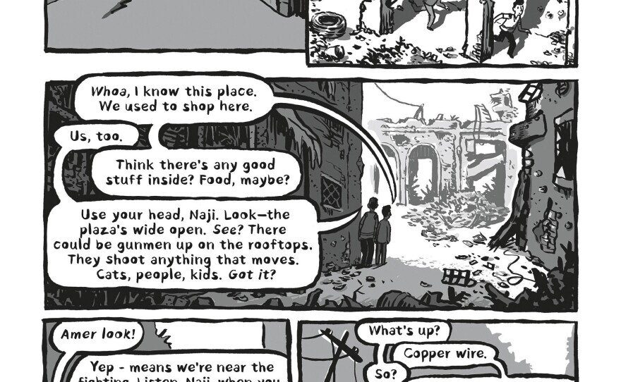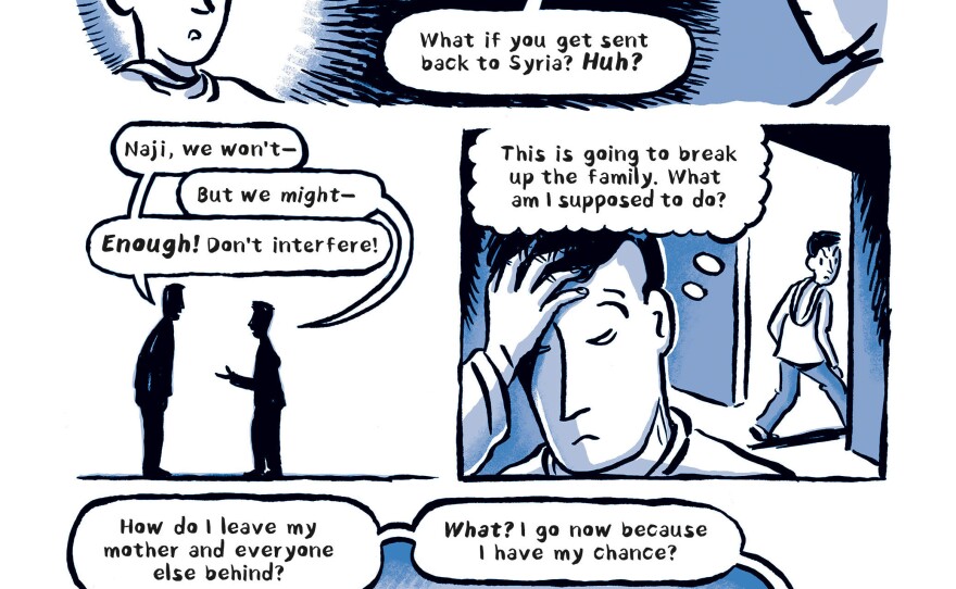 Reporter Jake Halpern, who chronicled Naji's story with artist Michael Sloan in a Pulitzer prize-winning series for the New York Times, was interested in telling the experience of a Syrian refugee family through the eyes of a young adult. Halpern is the co-author of several young adult novels, adventure stories where kids are left to their own resources to save themselves (and sometimes the world as well). In his books, Halpern says, "the veneer of childhood falls away, [along with] this idea that life is good and society is there and parents are there. The kids are left to fend for themselves and figure it out for themselves."