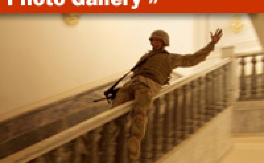 The photo that launched his career emerged while he was coming to this realization. It is an image of young Marine, sliding down a banister in one of Saddam Hussein's captured palaces.