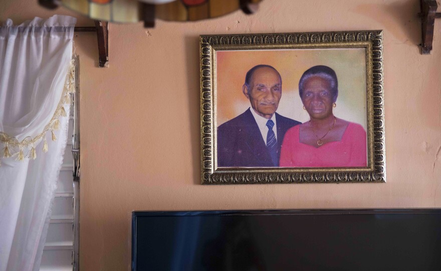 Paulina Recio, 84, keeps a portrait of her and her late husband in her living room in Restauración, Dominican Republic. Paulina is half-Dominican, half-Haitian. "Dominicans and Haitians fell in love then, just like today," she says. When she grew up in Restauración, she says, it was a completely Haitian town. "Dominicans didn't live here, it was Haitians."