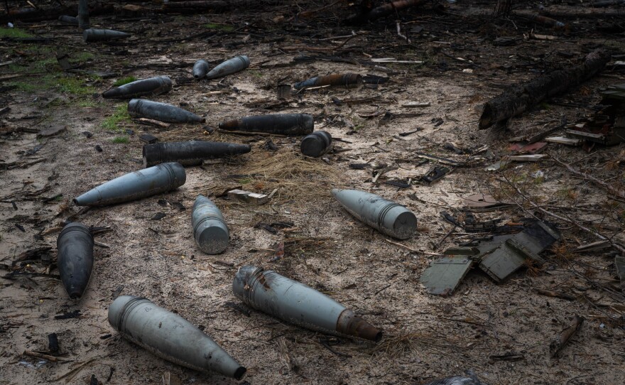 The work is dangerous. Unexploded ordnance litters the ground. Jagged metal is buried in the soft dirt. A local official tells NPR it will take years to demine the woodland, where residents like the man logging used to collect mushrooms.