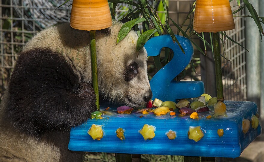 One of the San Diego Zoo's giant pandas celebrated his second birthday Tuesday with cake and presents.