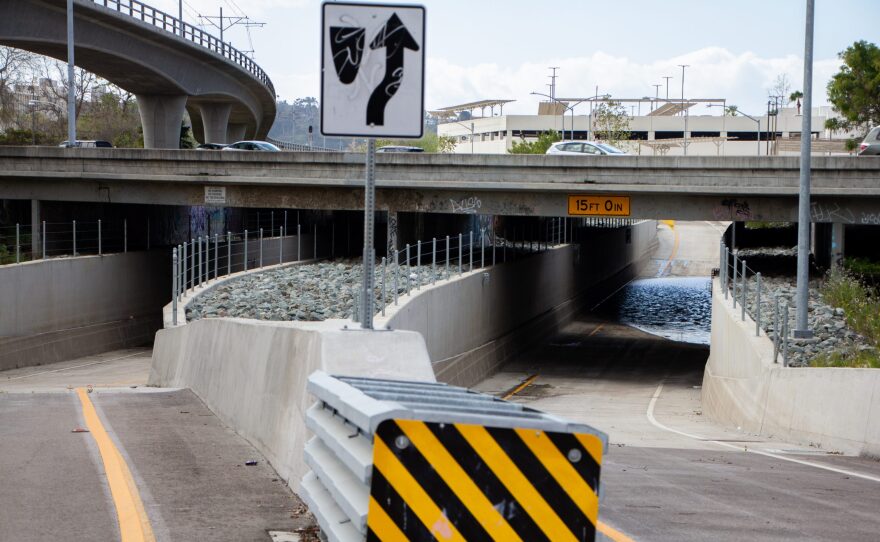 The morning after Fashion Valley received about a half inch of rain in early March, water pooled in the deepest part of the underpass.