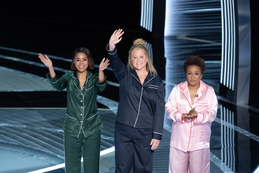 The show's attempts at comedy often bombed. It was hosted by three talented women, Regina Hall, Amy Schumer and Wanda Sykes, but they were rarely on stage and when they were the material was often bad. Although Schumer joked that three women were "cheaper" than one male host.