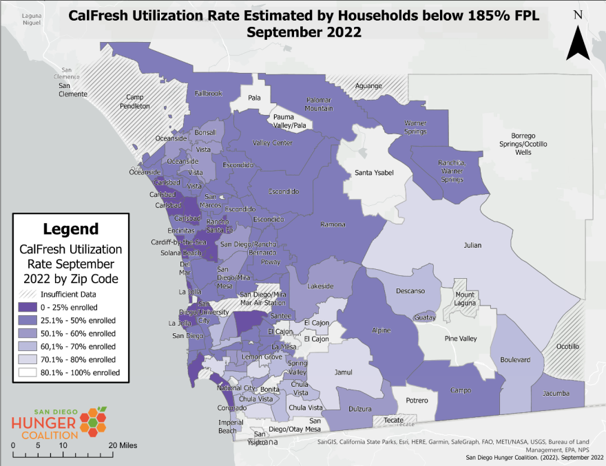 More than 285,000 San Diego County residents are eligible but not enrolled for CalFresh benefits, according to a newly completed study by the San Diego Hunger Coalition. The organization said a conservative estimate was based on a lower income limit and census numbers that undercount the population.