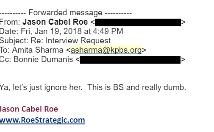 KPBS reached out to Dumanis to ask her what plans, if any, she had for the Azano-related money. Her political consultant Jason Cabel Roe responded asking for extra time to reply. But one day later, Roe sent an email to KPBS stating, “Ya, let’s just ignore her. This is BS and really dumb.”