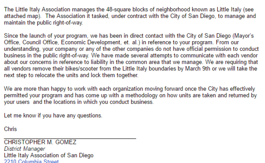 But before Civic San Diego officials had a chance to decline that request, Little Italy Association District Manager Chris Gomez sent an email to representatives of the bike sharing companies threatening to evict the bikes from the neighborhood. Gomez said he had been in contact with city officials, and that he believed the bike sharing companies did not have permission to leave their bikes on the public right-of-way.