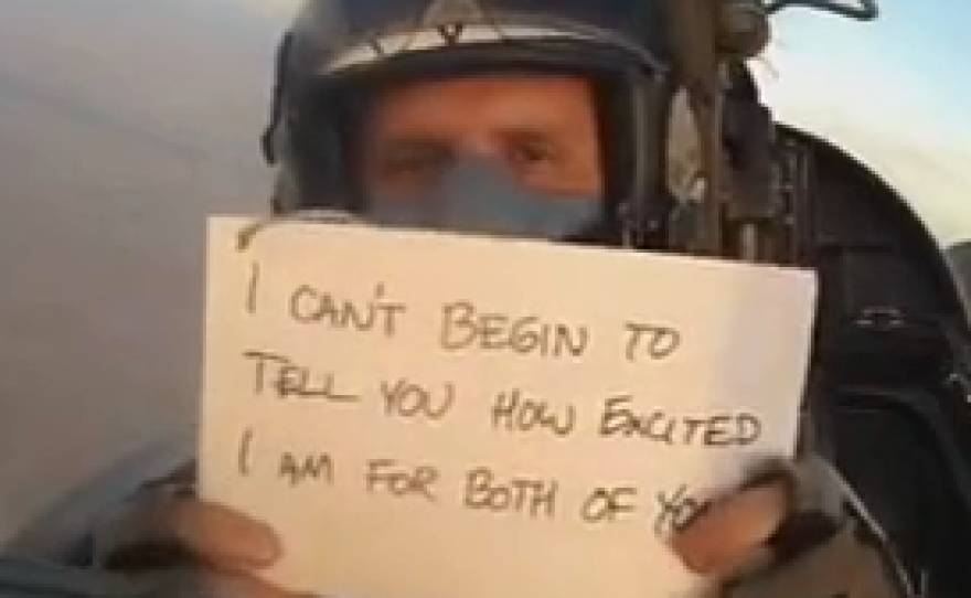 Marine Corps Captain Matthew Krivohlavy couldn't make it to his brother's wedding because he's deployed in Afghanistan. So Krivohlavy got creative - he toasted the new bride and groom midair from the cockpit of his jet.