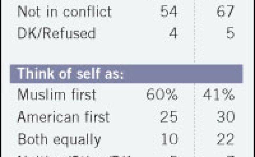 But the study found some surprising signs of discontent. More than half of Muslim Americans believe that the U.S. government singles Muslims out for extra surveillance. More than half of Muslims overall hold a very unfavorable view of al-Qaida — but only 36 percent of African-American Muslims do. Only one in four Muslims believes that Arab men conducted the terrorist attacks of Sept. 11, 2001. And most disturbing was what Kohut called "pockets of sympathy for extremism."