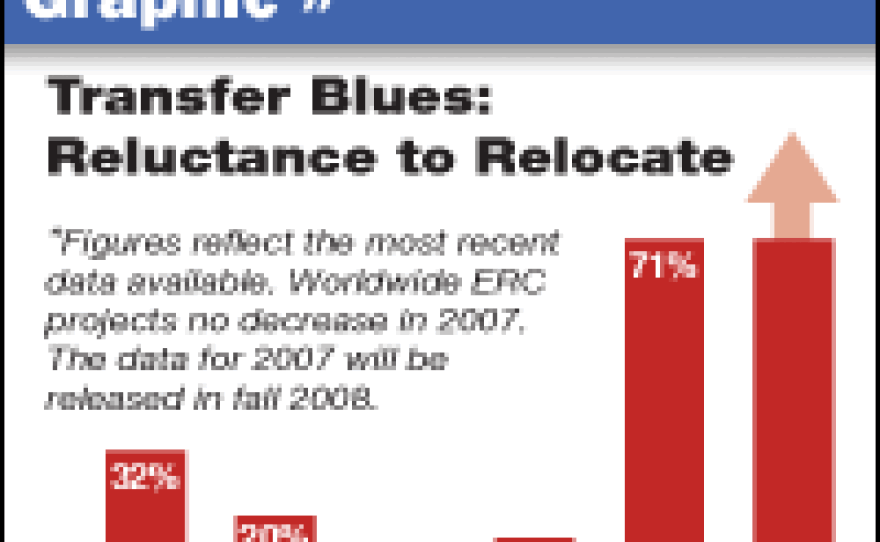 ERC Worldwide, a workforce mobility association, annually surveys its members, which include companies that frequently relocate and transfer employees. It found members reporting a 50 percent increase over the past four years in the number of employees in commuter marriages, where spouses live in different cities. And it reports that in 2006, more employees were reluctant to relocate: "More than 70 percent of the respondents reported 'slowed real estate appreciation/depressed housing market at the old location' as the reason their employees are averse to moving."