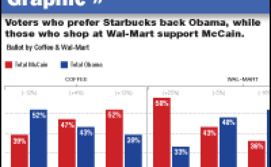 Even though the two candidates are viewed favorably by about the same number of people, there are some big cultural splits. Of people who get their coffee at Starbucks, 52 percent favor Obama while 39 percent prefer McCain. Of people who frequent Wal-Mart, 58 percent favor McCain while 33 percent prefer Obama.