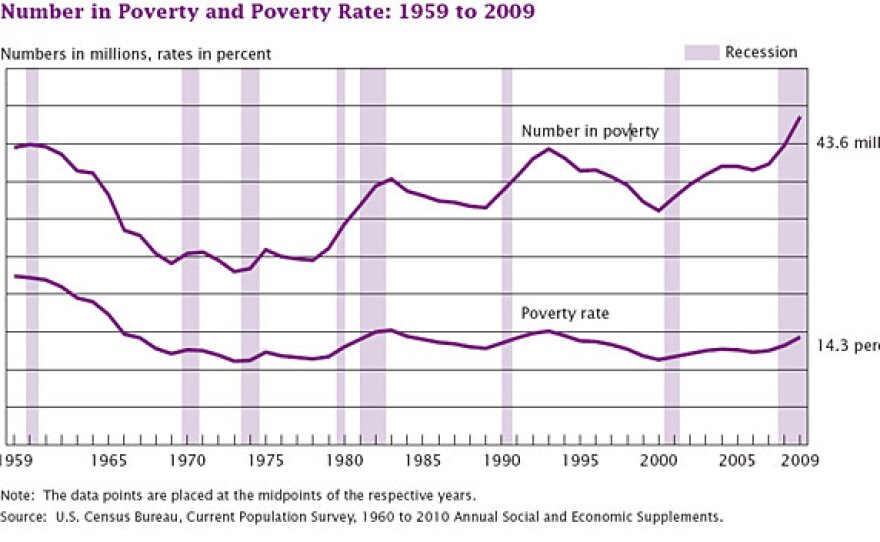 More than 43.6 million people were impoverished in 2009 — or roughly 1 in every 7 — a 1 percent increase from the year earlier and the largest number recorded in 51 years. The 14.3 percent poverty rate is the highest since 1994 and the third consecutive annual increase.