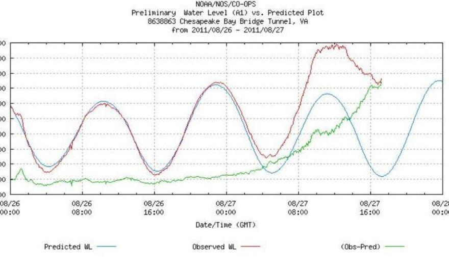 The blue line is the normal rise and fall due to tides. The red line is what's actually happened today — more than a foot and a half of additional water. And the green line measures how much more water Irene has pushed into the bay — even before she has reached the area.