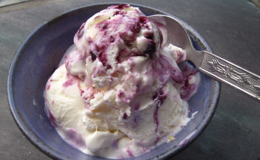 When the ice cream base is thoroughly chilled, freeze it in your ice cream maker according to the manufacturer's instructions. When it is done, pour roughly 1/3 into a container. Top with half of the chilled blueberry mixture and add another 1/3 ice cream base. Top that layer with the remaining blueberry mixture, then cover with the remaining ice cream base. Put in the freezer to set, 2 to 4 hours.