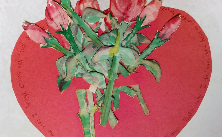 For our first Valentine's Day, the love of my life wanted to give me a dozen roses. We had little money, so he did what he does best by making me a red heart with 12 water-colored blooms. It says: "I Love you sweet thing. I Love the way you love me and Helene and Jenny. That's why I believe you have a golden heart. I love you. David, David"