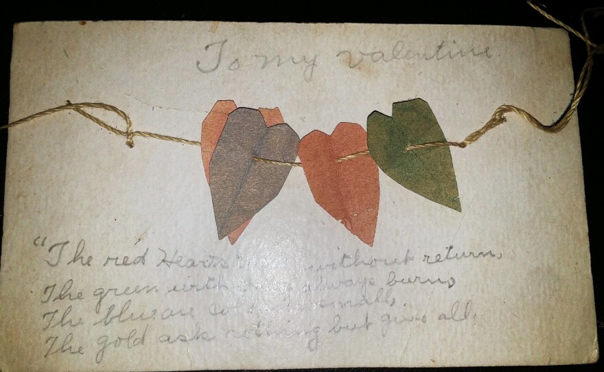 One day, as I was looking through a box of her old report cards from grade school, I found this handmade Valentine she had saved. It was given to her by a friend named "Edith." It's on an old piece of cardstock, written in pencil, so it is very faded. It isn't dated, but it was with other items dated as early as 1910. She would have been 12 years old at that time.