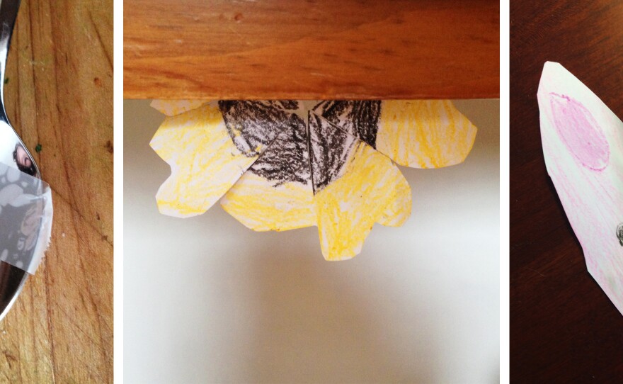 One was a simple red heart taped to the inside of a spoon. I found it while I was making my morning coffee and, of course, it brightened my day. Another was a pink bunny, who was especially cute because he was lopsided. Yet another was a series of yellow hearts arranged like petals of a sunflower. It was carefully taped to appear as if it were growing out from under my desk.