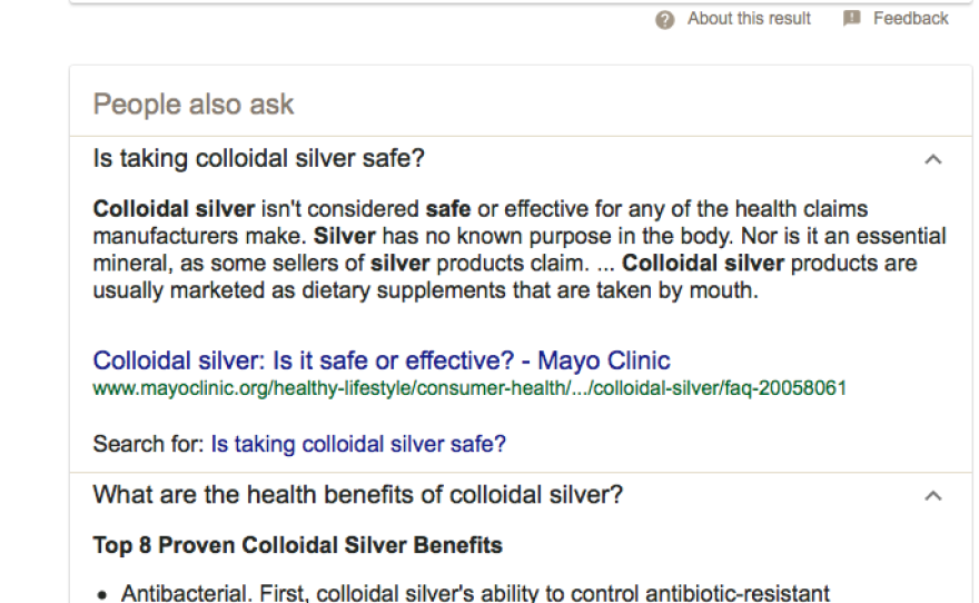 But ask Google if colloidal silver is safe and the NCCIH website doesn't show up until near the bottom of the first page, below the result from DrAxe.com.