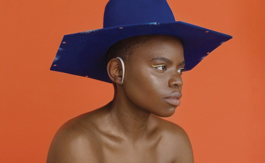 In the photo, Laetitia Tamko sits by herself against a deep orange backdrop, wearing a sleeveless black top and a hexagonal blue hat handwoven by the L.A. hatmaker Ariana Valenzuela. Tamko says that "it calls you in and invites a generous listen."