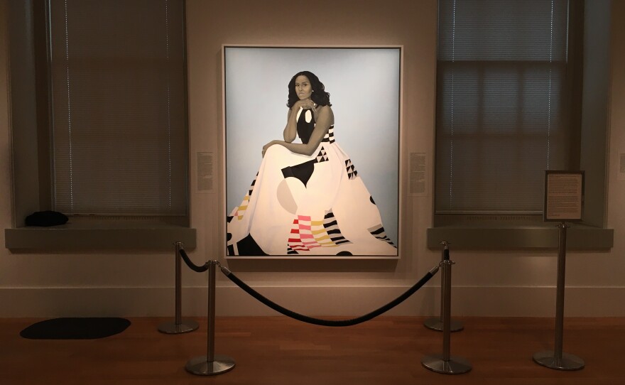 In Washington, D.C., dozens of people line up behind velvet ropes every day to admire artist Kehinde Wiley's interpretation of the former president. It features Obama sitting at the edge of a wooden chair, surrounded by lush foliage. Pink and white flowers are dispersed across the canvas.