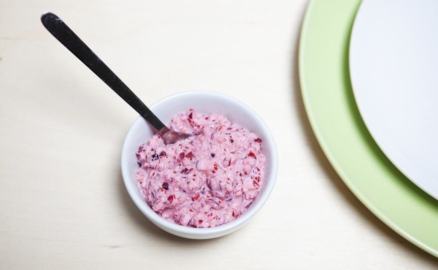Looks interesting, no? Maybe a bit ... unusual. You were expecting a sweet cranberry sauce. But this is a relish — it's tangy, spicy and (at least one humorless observer has noted) Pepto Bismol pink.