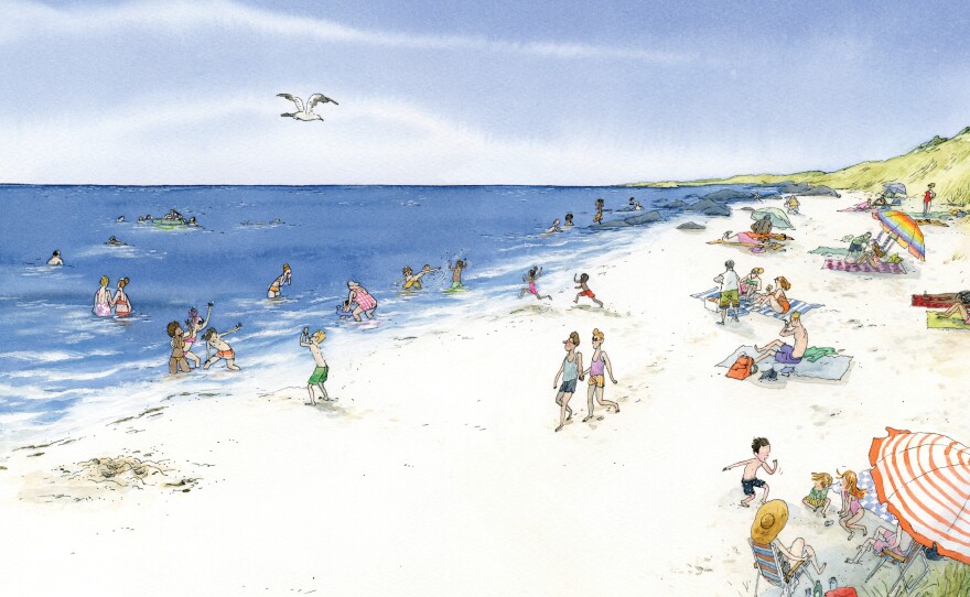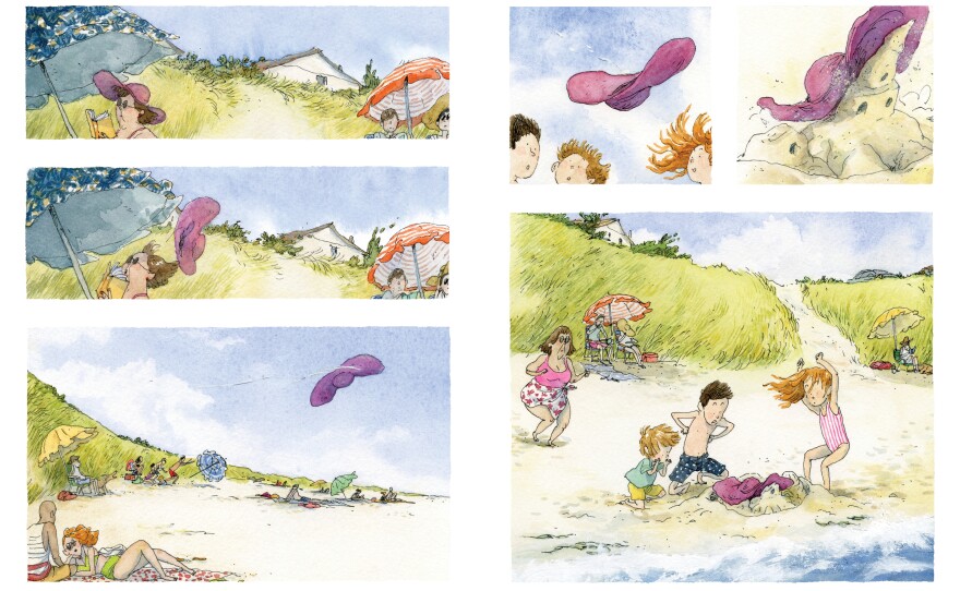 Leng illustration's stay pretty true to real life. A trio of siblings — who Lawson says even look like his kids, though he didn't share photos with Leng — spend the day building sandcastles and watching them get destroyed by a flying hat, an errant toddler and the surf.