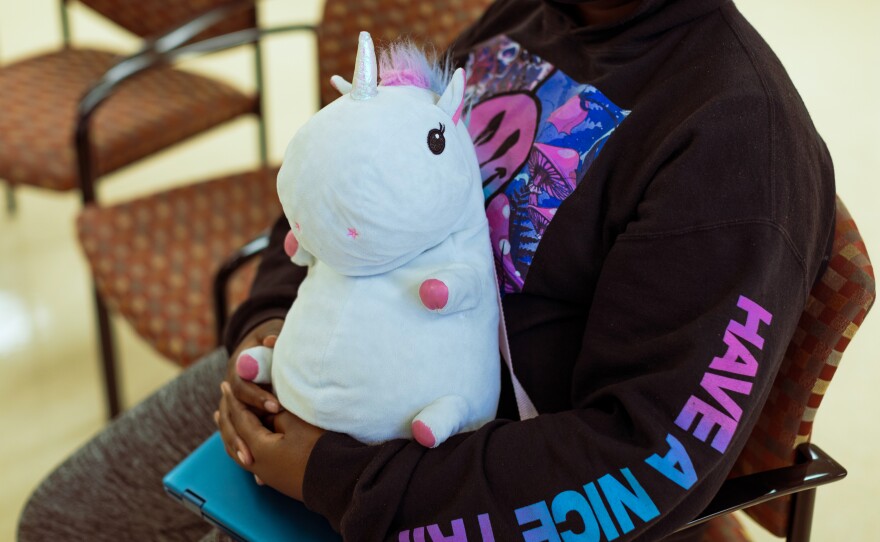 Keanna Tyson holds on to her backpack during a group session at Steve's Club in Atlantic High School. The Club meets every twice a month to talk about what they are going through.