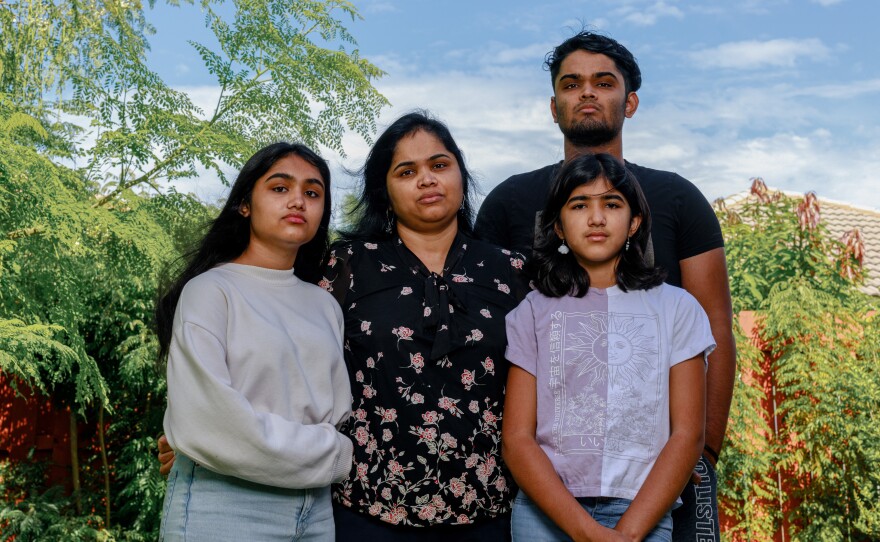 Elizabeth, left, poses for a family photo with her mother Shibi, center, and siblings Shaun and Teresa. All her children have struggled in different ways since their father's death, says Shibi, and schools should provide more mental health support for students who are grieving.
