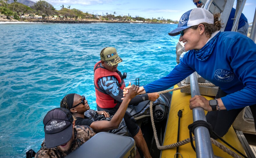DEROSE: That was the plan. Once they loaded up, we joined them for about a 45-minute boat ride to Lahaina. The green mountains give way to beaches and cliffs that give way to sparkling, cerulean ocean. It is stunning. Jennifer Kogan is one of the tour operators making these supply runs.