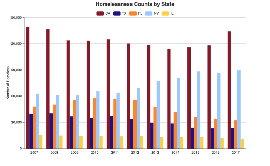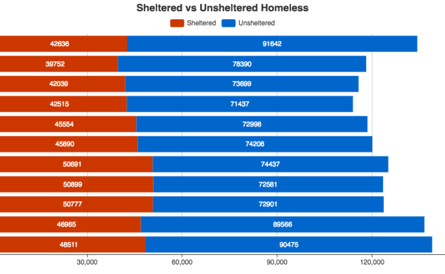 The state has the highest percentage of unsheltered homeless individuals in the country, at slightly under 70 percent, according to data from the U.S. Department of Housing and Urban Development. This means that the vast majority of the state’s homeless population is not living in emergency shelters or transitional housing. Instead, they are living on the street or in a place “not meant for human habitation."